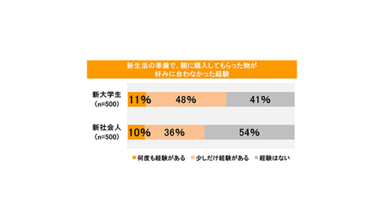 大学入学時や就職の際に「新生活の準備で、親に購入してもらったものが好みに合わなかった経験」について質問したところ、全体の新大学生の59%、新社会人の46%が、「経験がある(何度も経験がある+少しだけ経験がある)」と回答しました。