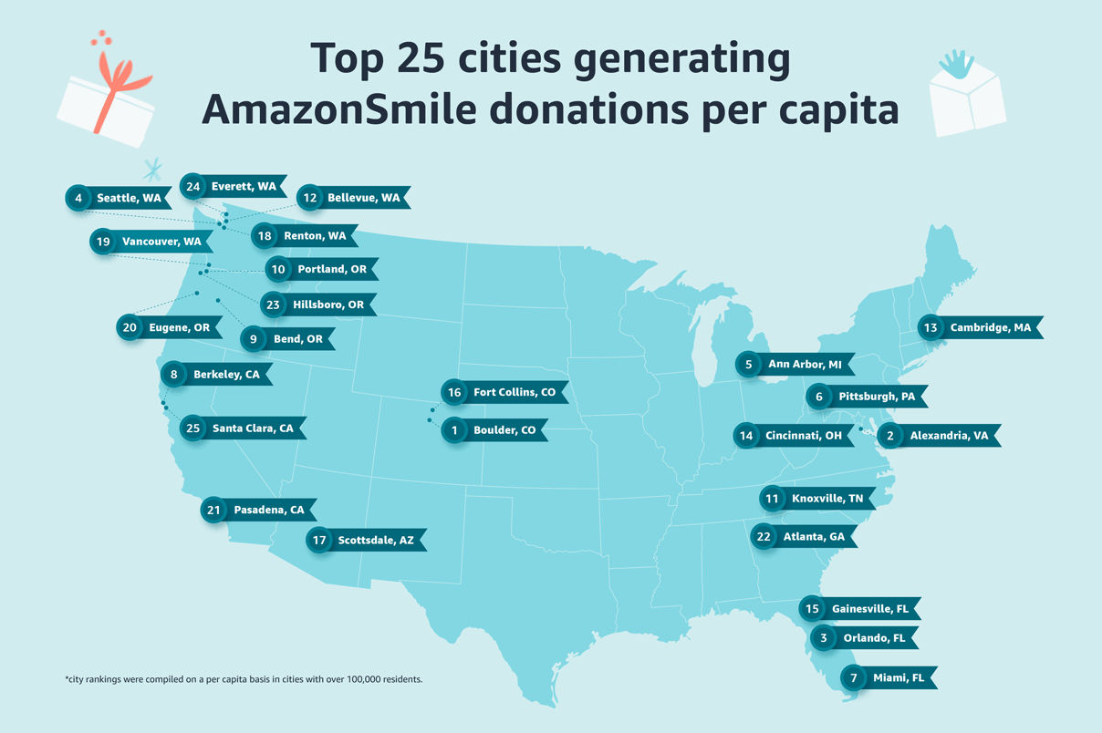 2020年の1人当たりのAmazonSmile寄付額が多い米国のトップ25都市* (免責事項:*本都市ランキングは10万人以上の人口を持つ都市の一人当たりのランキングです):ボールダー(コロラド州)、アレキサンドリア(バージニア州)、オーランド(フロリダ州)、シアトル(ワシントン州)、アナーバー(ミシガン州)、ピッツバーグ(ペンシルベニア州)、マイアミ(フロリダ州)、バークレー(カリフォルニア州)、ベンド(オレゴン州)、ポートランド(オレゴン州)、ノックスビル(テネシー州)、ベルビュー(ワシントン州)、ケンブリッジ(マサチューセッツ州)、シンシナティ(オハイオ州)、ゲインズビル(フロリダ州)、フォートコリンズ(コロラド州)、スコッツデール(アリゾナ州)、レントン(ワシントン州)、バンクーバー(ワシントン州)、ユージーン(オレゴン州)、パサデナ(カリフォルニア州)、アトランタ(ジョージア州)、ヒルズボロ(オレゴン州)、エバレット(ワシントン州)、サンタクララ(カリフォルニア州)