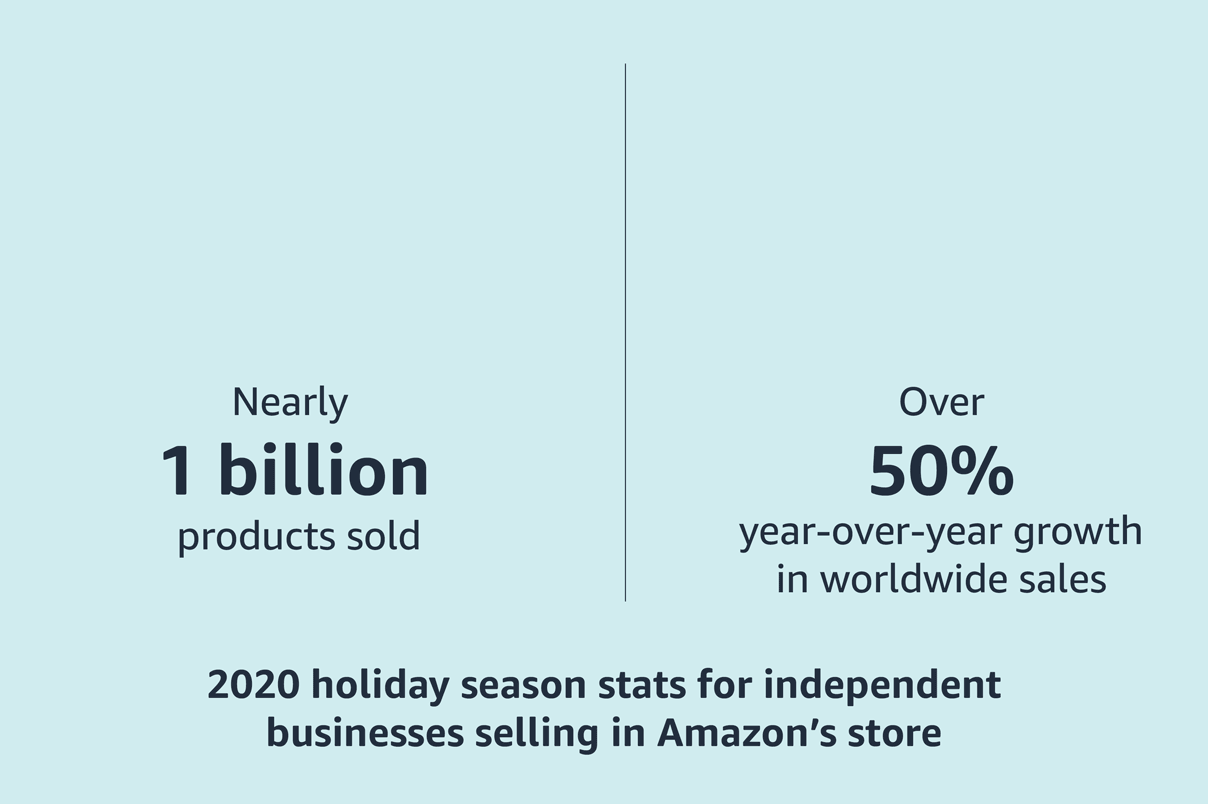 - 2020年のホリデーシーズンは、Amazonで販売する中小規模事業者様にとって過去最高のシーズンとなり、全世界の売上高は前年同期比で50%増となりました。