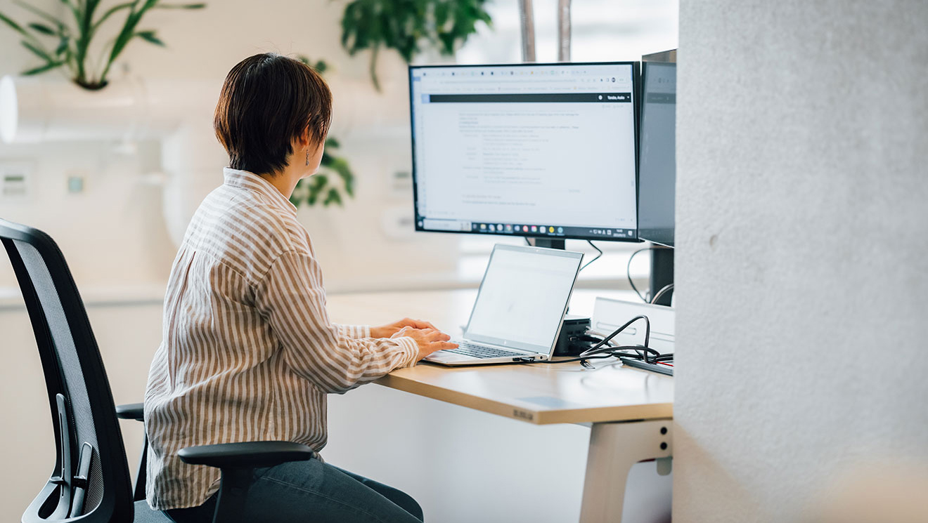 同じフロアには、ドロップインで仕事ができる電源やモニターなどが用意されているスペースがあります。他のオフィスから訪れた社員も気軽に仕事ができるスペースです。