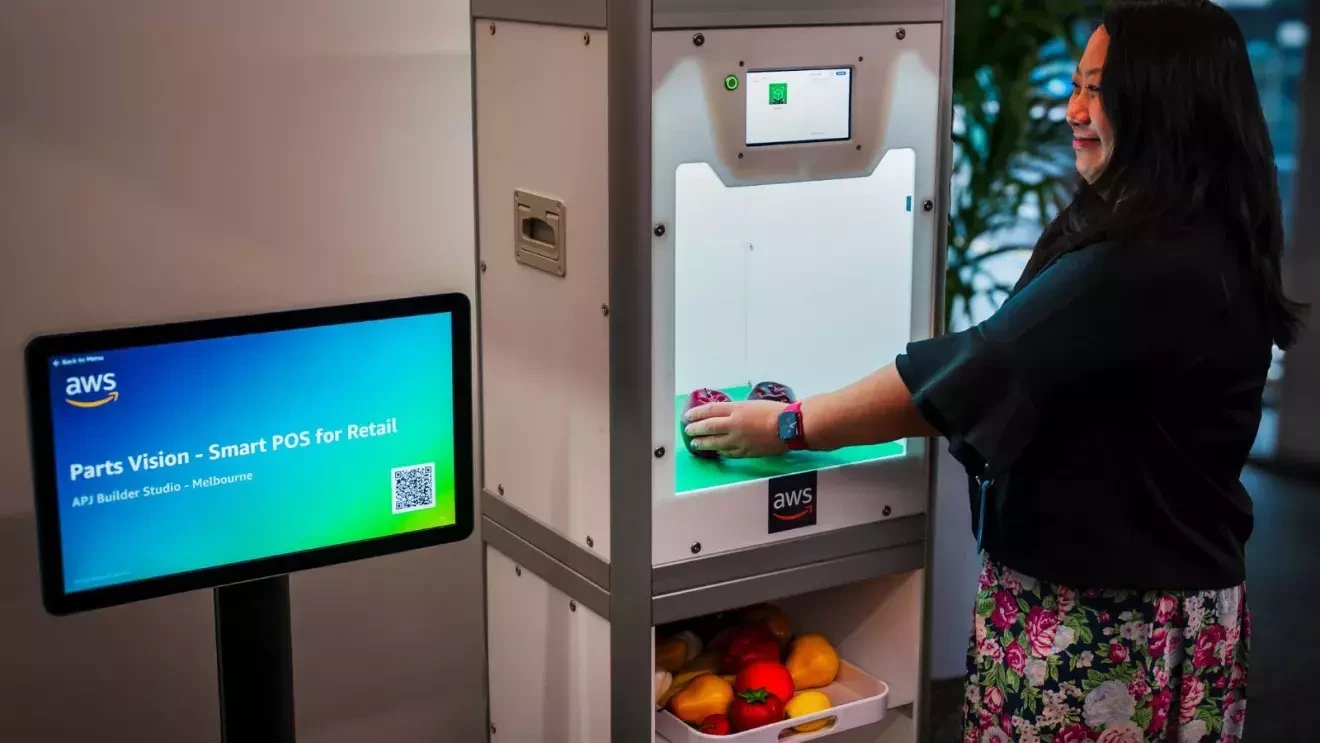 AWSのコンピュータビジョン技術を使ったセルフチェックアウトPOSのデモンストレーションでは、高解像度カメラと重量計を用い、バーコードのない商品を自動的に検知して識別できるようになっています。この技術によってセルフ決済のプロセスが効率化され、お客様はさらに素早く便利にショッピングできるようになります。