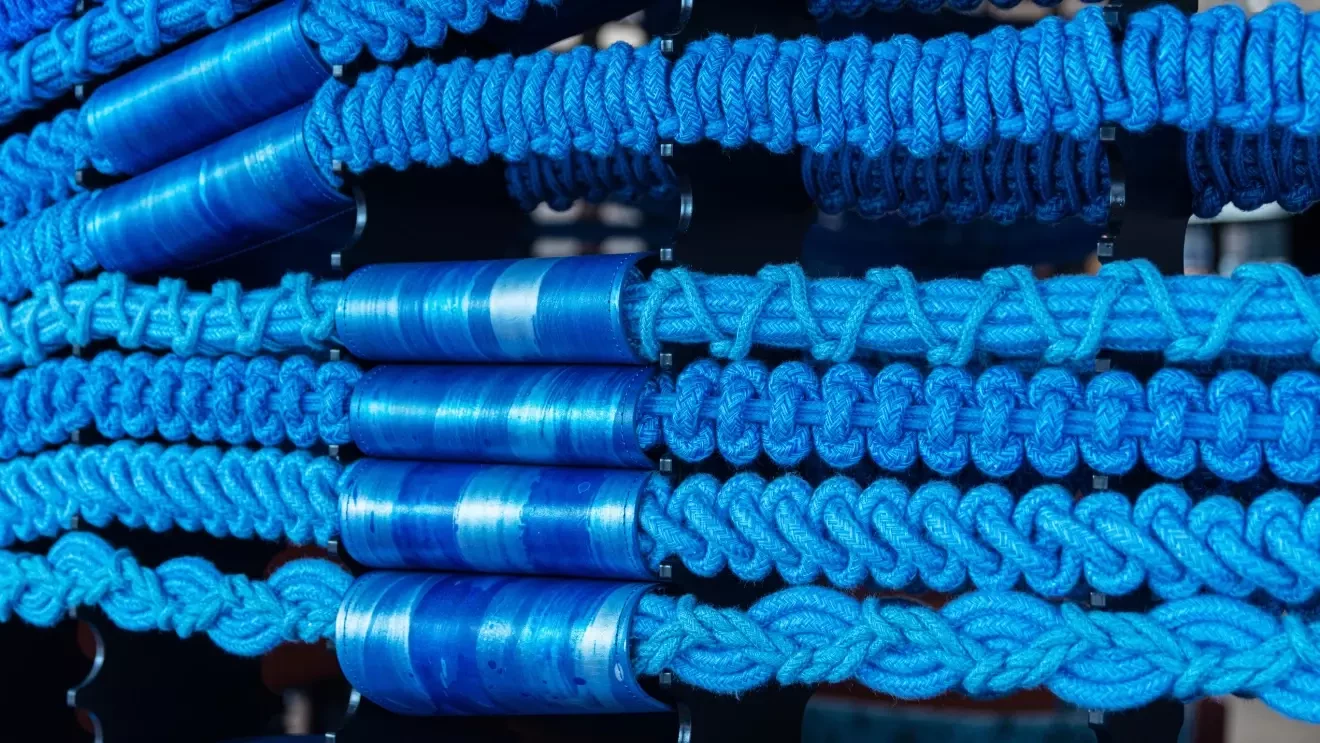 また、中央階段の前の壁面には、糸で作られたテキスタイル彫刻が展示されています。この作品は9フロアに渡っており、ジュート麻、テラコッタ、ユーカリ、ルーサイト、真鍮といった素材の使用によって、建物が経た用途の変遷を表しています。