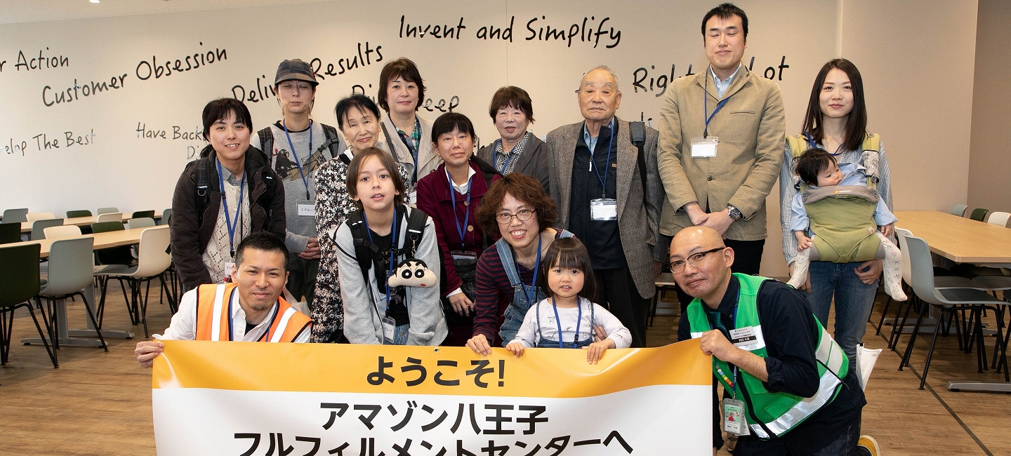 2018年4月の開業から1周年を迎えた八王子フルフィルメントセンター(以下八王子FC)は、従業員のご家族向けに内覧会を開催。本FCの入出荷工程で働くパートナー企業様の従業員4名とそのご家族11名の計15名が参加しました。