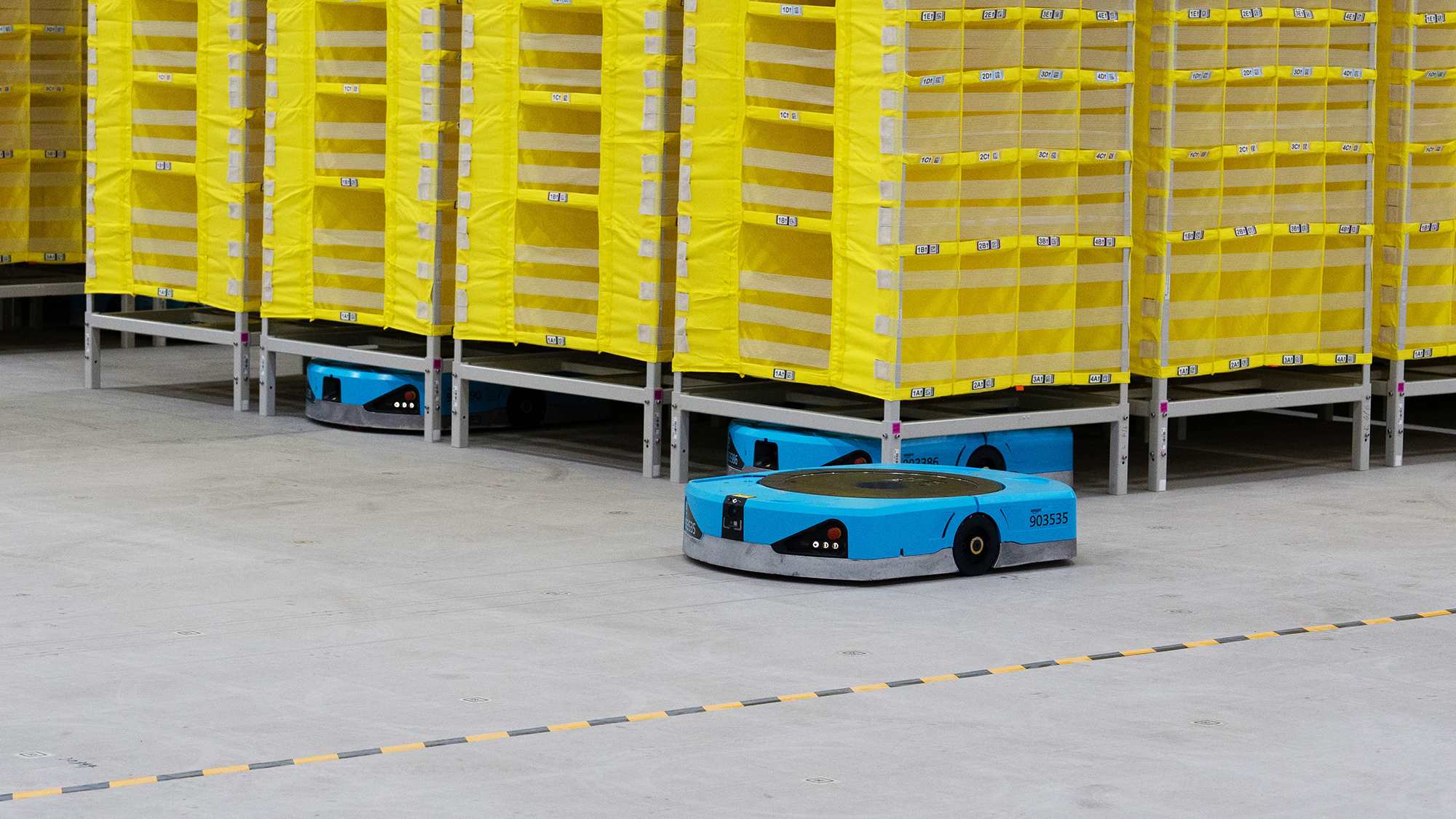 千葉みなとFCの2〜4階部分は、入荷した商品の棚入れやお客様から注文があった際に商品の棚出しを行う商品保管フロアです。中心部の広いスペースではAmazon Robotics(アマゾン・ロボティクス、通称AR)のテスト運転が行われていました。ARとは、「ポッド」と呼ばれる黄色い商品棚を「ドライブ」というロボットが持ち上げ、作業する人が待つ作業場、「ステーション」まで棚を運ぶAmazonの先端テクノロジーです。ロボットが商品の運搬を行うことによって、人が商品を探して歩く作業の負担が軽減されます。千葉みなとFCにはドライブ約2,600台、ポッド約3万台が導入され、AR導入拠点としては日本最大規模となります。
