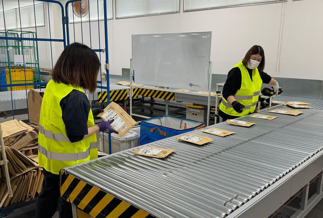 商品は長いコンベアに運ばれて、その左右に立つ人の手で配送エリアごとに仕分けされます。コンベアから行先ごとに商品を素早く見分けて棚へ。棚に置かれた商品のバーコードを読み取ると、収めるべき棚が光るので、その棚のボックスへ商品を収めます。これで仕分け作業は終了です。こうしたすべての作業が、この日女性だけの手で滞りなく進みました。