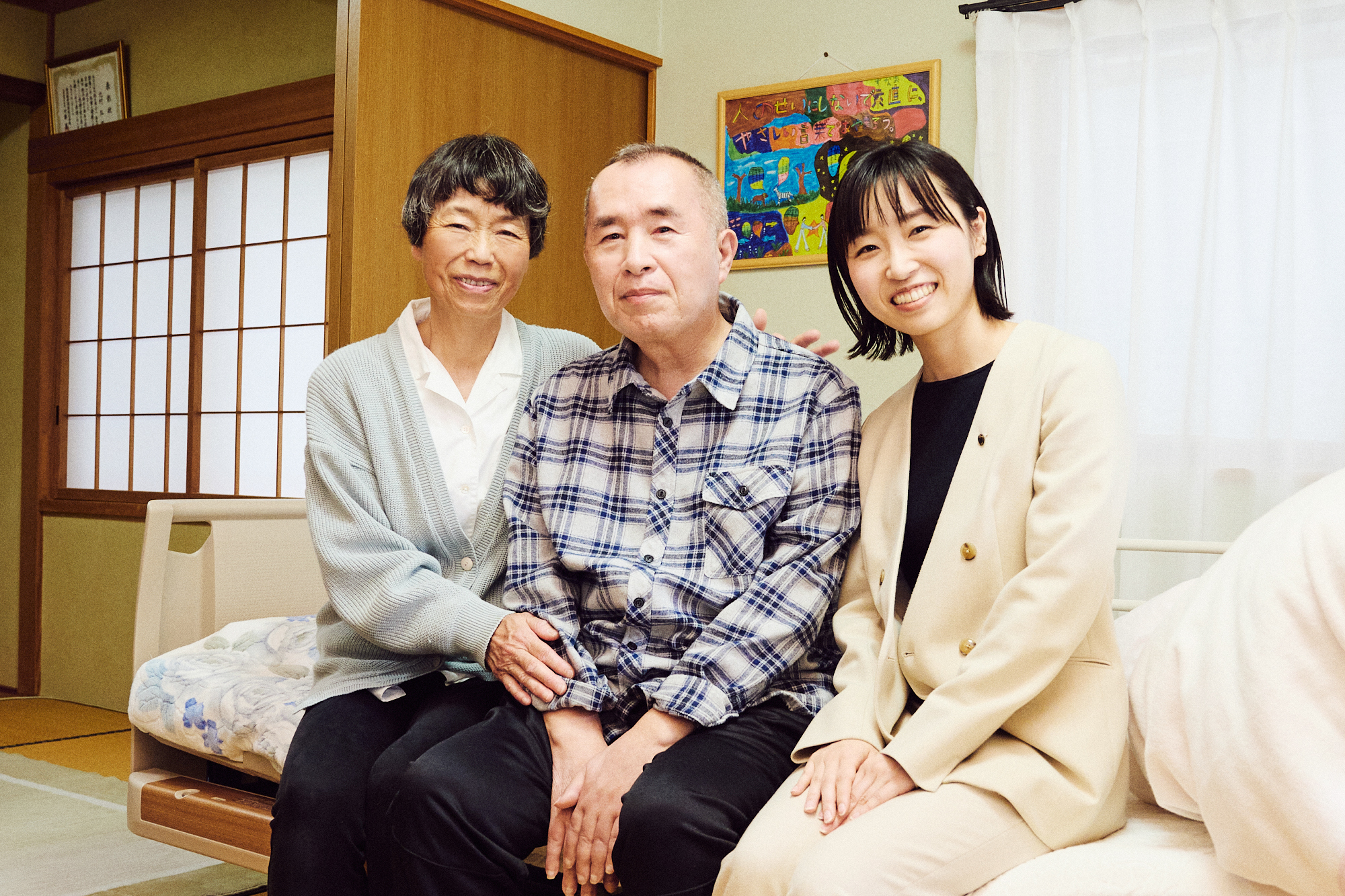 弘さんと談笑する新潟県長岡保健所の大井麻耶加さん(写真右) 「難病を患うと外出が困難になりますが、ICT機器を使用すれば世界とつながれます。発病によりどうしても気持ちが沈んでしまう患者様とご家族の皆さんには、AlexaやEcho Showでワクワクする体験をし、生活や生きることに楽しみを見つけてほしいと思います」(大井さん)