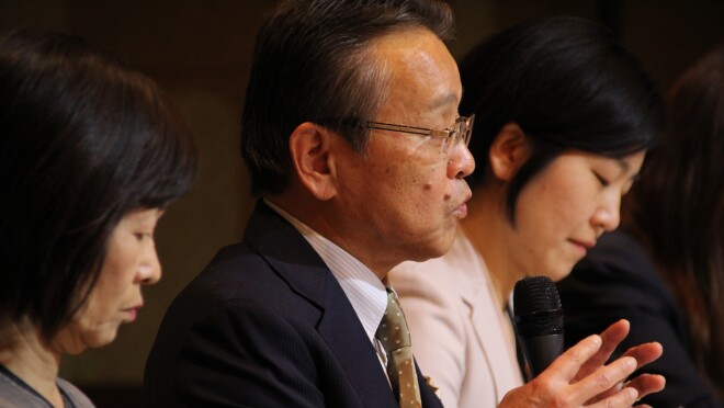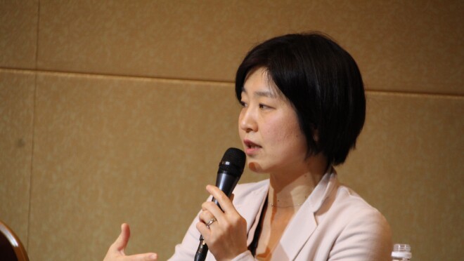 ディスカッションのテーマは「柔軟な働き方とその取り組み事例」です。モデレーターの日月さんは「現在、日本における女性就業率はアメリカよりも高い70.3%ですが、そのうち女性管理職はわずか7.2%。国内企業の約半数には女性管理職が存在しません。これから柔軟な働き方が浸透していけば、女性リーダーの増加が期待できるでしょう」と話します。