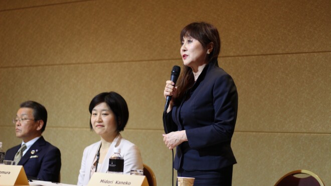 サミットは分科会形式で、丸1日かけて12のパネルディスカッションと4つのワークショップが開かれました。金子さんがスピーカーの1人として参加したセッションでは、三菱ケミカル株式会社 執行役員 ダイバーシティ推進担当の中田るみ子さん、株式会社ファンケル 代表取締役 社長執行役員 CEOの島田和幸さん、MSD株式会社 人事部門 タレントマネジメントグループの戸村玲子さんらがスピーカーとして、またモデレーターとして株式会社ハーモニー人材 代表取締役社長の日月真紀子さんが登壇しました。