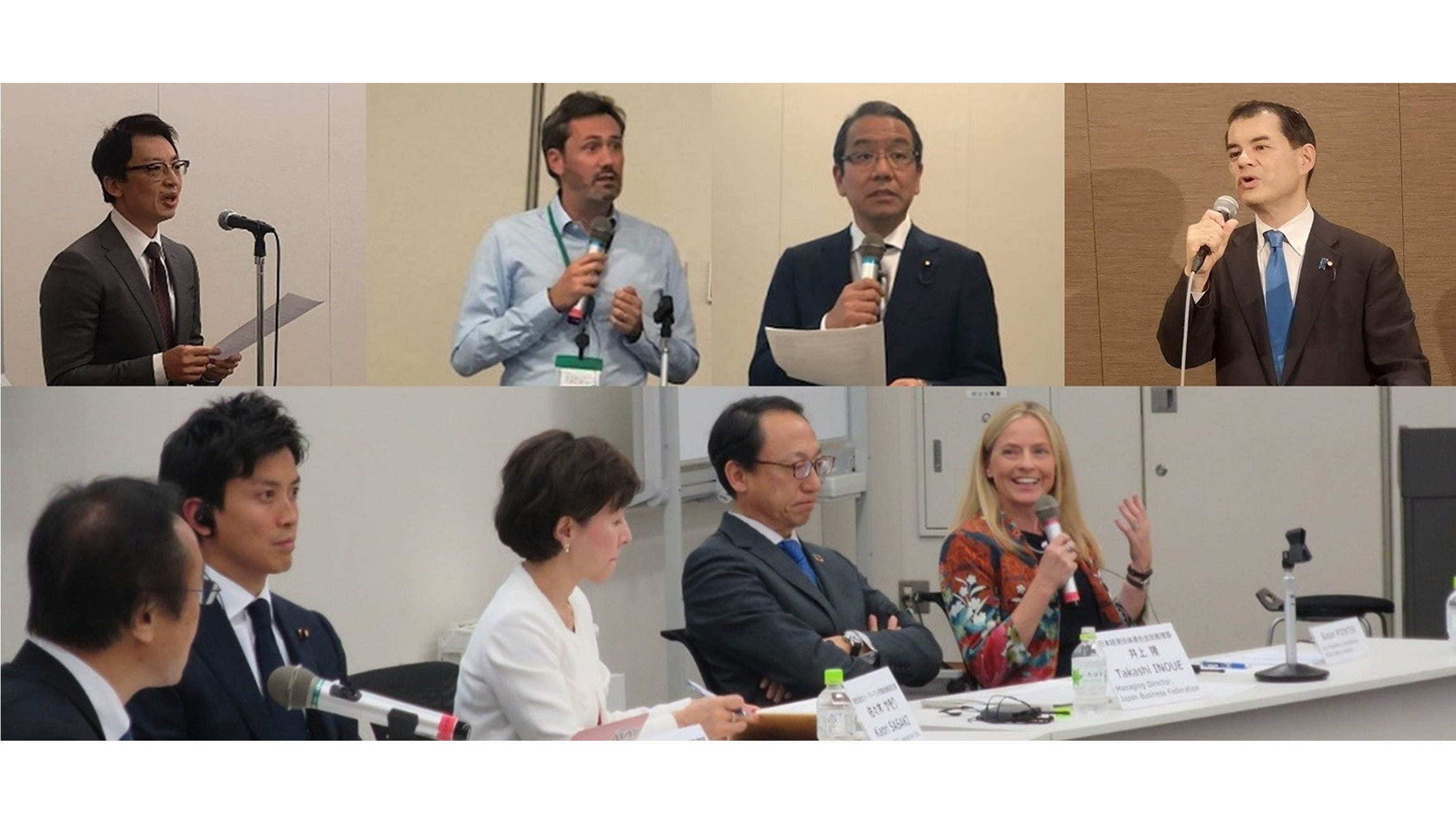 基調講演を行った前内閣府副大臣 越智隆雄 衆議院議員とAmazonの機械学習専門家 Cédric Archambeauその後のパネルディスカッションでは、モデレーターを務めた日本経済新聞 編集委員の関口和一氏による進行の下、Society5.0の実現に向けた課題などについて、パネリストとして登壇した前総務大臣政務官 小林史明衆議院議員、イーウーマン 代表取締役社長、佐々木かをり氏、経団連 常務理事 井上隆氏、Amazonの国際公共政策担当 ヴァイス・プレジデント Susan Pointerがそれぞれの立場から意見を述べました。