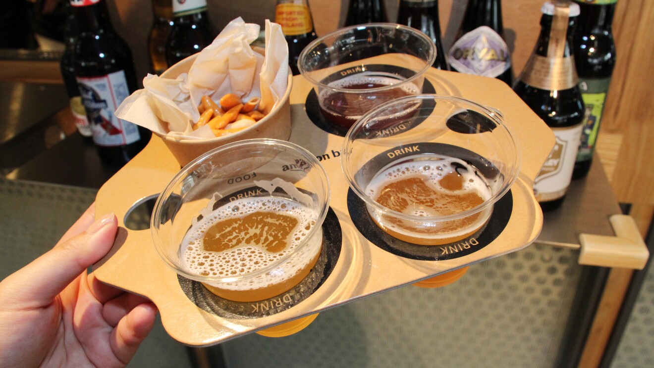 続いては、ビールや焼酎、ウイスキーなど9つのお酒のカテゴリーから飲みたいものを決め、それぞれのカウンターがある会場へと移動します。最初は「ビール」を選びました。受付で渡されたパンフレットには、カテゴリーごとに厳選された20種の銘柄が並びます。その中から3つの銘柄を選びお酒の番号を伝え、カウンターでテイスティングセットをオーダー。お酒に合うおつまみも提供されます。