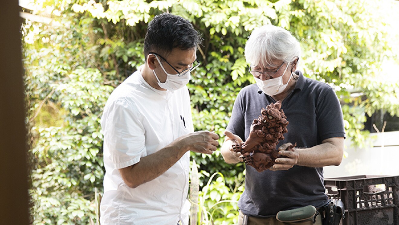 沖縄県うるま市にある小さな工房。真剣な眼差しでシーサーを作る職人の名波均さんを、ゆいまーる沖縄直販部小売課の松田哲郎さんが固唾をのんで見守っています。ゆいまーる沖縄は、県内の多くの職人や生産者と直接つながり、沖縄県内の伝統工芸品や民芸品、食品などを幅広く取り扱う地域商社です。島尻郡南風原町にある実店舗「ゆいまーる沖縄 本店<Storage & Lab.>」、那覇空港内の実店舗「Dear Okinawa.」、ECサイト「ゆいまーる沖縄<Online>」等を通じて、沖縄文化の魅力を全国に発信しています。